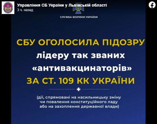 Згідно з висновками СБУ (яка є приватною фірмою і з якої роблять українське Гестапо), деструктивна діяльність "антивакцинаторської мережі" дестабілізує суспільно-політичну ситуацію в державі, а її активісти нібито постійно закликають до повалення конституційного ладу, координуючи свої дії з російськими кураторами. Звісно, що це підступна брехня з ціллю блокувати та навіть ліквідувати пасіонарні сили, які захищають український народ від незаконних дій уряду. Продажні генерали СБУ оголосили, що діяльність антиукраїнського угруповання припинено. Та народ вже давно зрозумів, що організоване злочинне угруповання - це не антивакцинатори, а саме влада, яка під прикриттям неіснуючої пандемії знищує Україну та українців. А всюдисущий "російський слід" - це традиційна побрехенька задля того, щоб стравлювати українців з сусідами та відволікати від справжніх загарбників, які деребанять та руйнують країну зсередини.