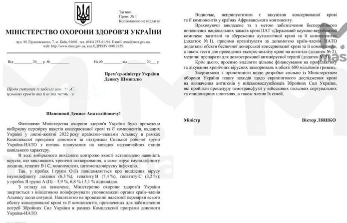 НАТО поставило в Україну заражену донорську кров для ЗСУ. Про це прем'єр-міністру Шмигалю у листі доповів міністр охорони здоров'я Ляшко. У законсервованій крові було виявлено ВІЛ, гепатит та інші небезпечні хвороби. Кров надійшла після прохання МОЗ до країн Альянсу надати таку допомогу для поранених на фронті. Поміч у вигляді 62-х тисяч літрів надійшла, але як виправдовуються відповідальні особи, жодних перевірок не проводилося. Тож медики України отримали консерванти, дослідили кров та виявили у ній цілі букети страшних хвороб - ВІЛ, гепатит "В", гепатит "С", мононуклеоз, цитомегаловірусну інфекцію. Всі дані та цифри - з архіву прем'єр-міністра України, який зламали хакери з хакерської групи "Kombatant". У листі було наголошено, що закупівля консервованої крові та її компонентів для потреб ЗСУ "на африканському континенті" неприпустима. Також був зроблений акцент на необхідності подальших постачань крові, але з аналізом на антитіла. І на останок, користуючись нагодою, МОЗ запросив у Шмигаля ще 680 млн. гривень на "профілактику вірусних захворювань".